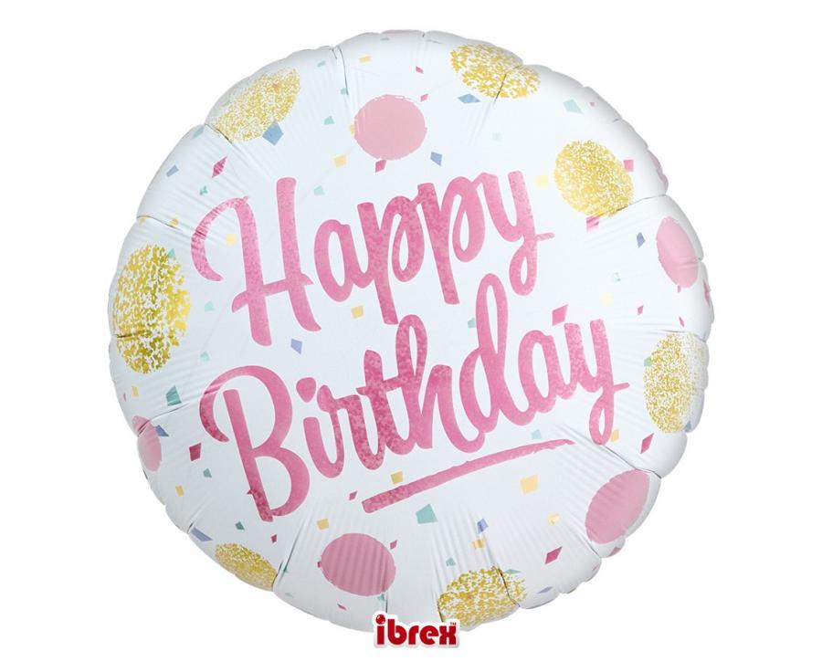 Balon Ibrex Hel, okrągły 14", Happy Birthday Gold&Pink Dots, packed
