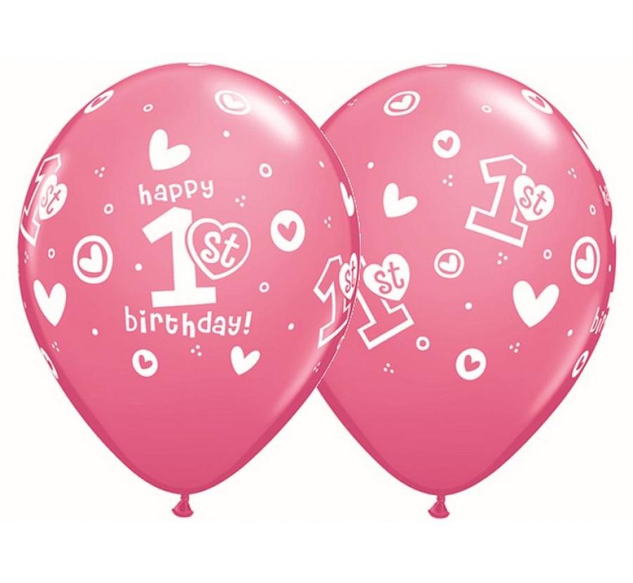 Balon QL 11" z nadr. "1st Happy Birthday", pastel różowy / 25 szt.
